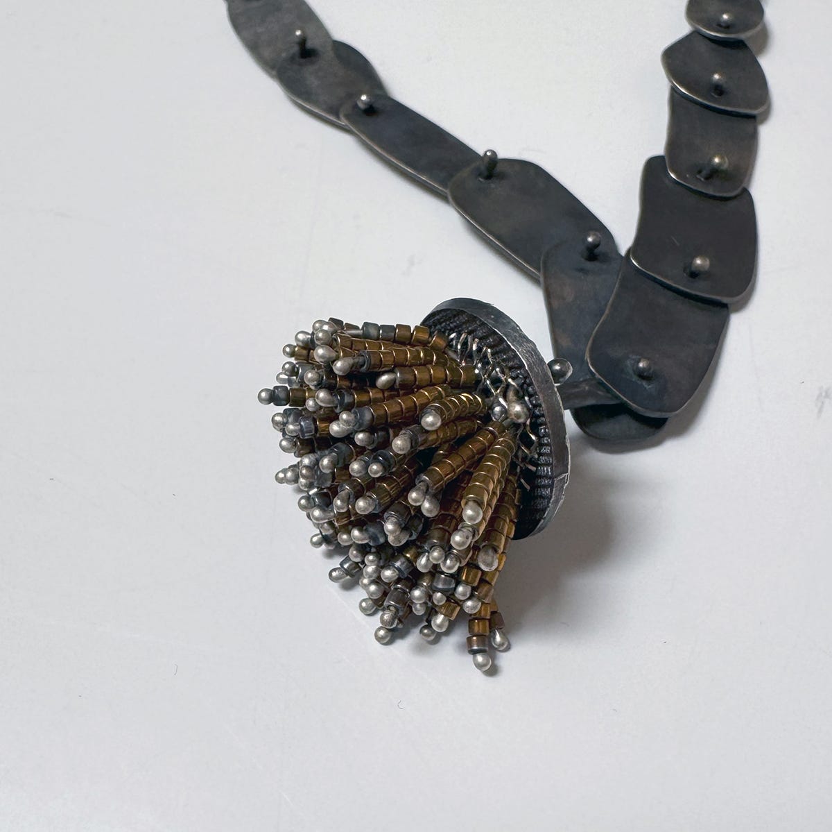 The necklace is made up of small sterling silver disks that have been riveted together. The focal piece is a cluster of “heat riveted” or “pinned” seed beads clustered to resemble the Fairy Duster Bloom. You can read more about it here.